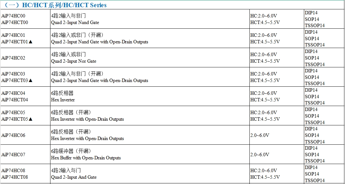 HC(高電流)和HCT(高電流TTL兼容)系列是74系列中應用最廣泛的類型。國產替代產品如AiP74HC系列和AiP74HCT系列,提供了與TI、NXP等廠商相同的功能和性能。以下是一些常見型號的對比: