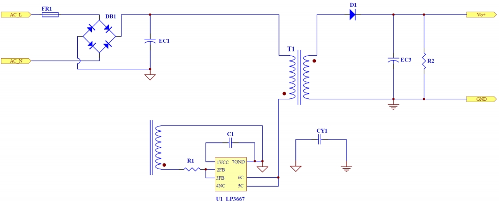 充電器的電路設計是其核心部分,其電路圖展示了各個元件的連接關系和功能。從電路圖中可以看出,該設計采用了典型的開關電源架構,主要包括輸入整流濾波電路、主控芯片 LP3667B、變壓器 T1、輸出整流濾波電路以及保護電路等關鍵部分。輸入整流濾波電路將交流輸入轉換為直流,并通過濾波電容去除高頻噪聲,為后續(xù)電路提供穩(wěn)定的直流輸入。主控芯片 LP3667B 作為整個充電器的“大腦”,負責控制開關頻率、占空比以及實現(xiàn)各種保護功能,確保充電過程的安全與高效。變壓器 T1 是實現(xiàn)電壓轉換和電氣隔離的關鍵元件,其三繞組結構能夠有效降低電磁干擾并提高轉換效率。輸出整流濾波電路則將變壓器次級輸出的高頻脈沖轉換為穩(wěn)定的直流輸出,并通過濾波電容去除輸出紋波,保證輸出電壓的純凈度。