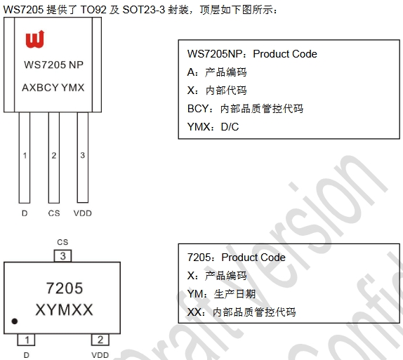 WS7205提供了TO92及SOT23-3兩種封裝形式,其引腳定義如下表所示: