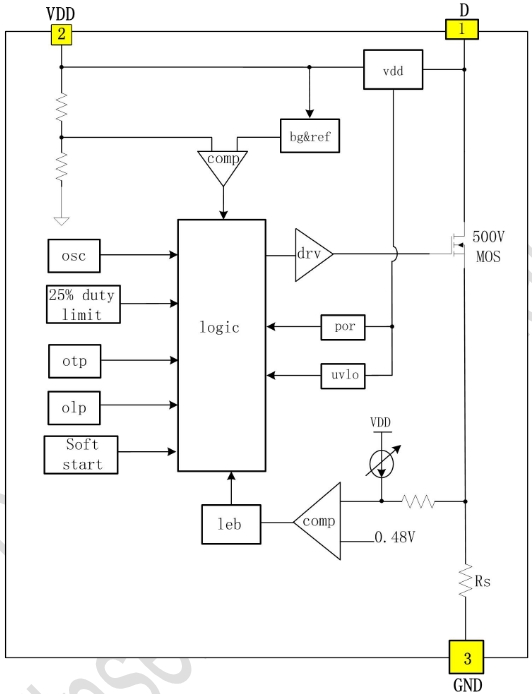 從框圖中可以看出,WS7205集成了高壓MOSFET、PWM控制器、電流采樣與保護電路、振蕩器與頻率抖動電路、軟啟動電路、過溫保護電路以及自動重啟電路等多個功能模塊。這些模塊協同工作,確保了芯片在各種工況下的高效、穩定運行。