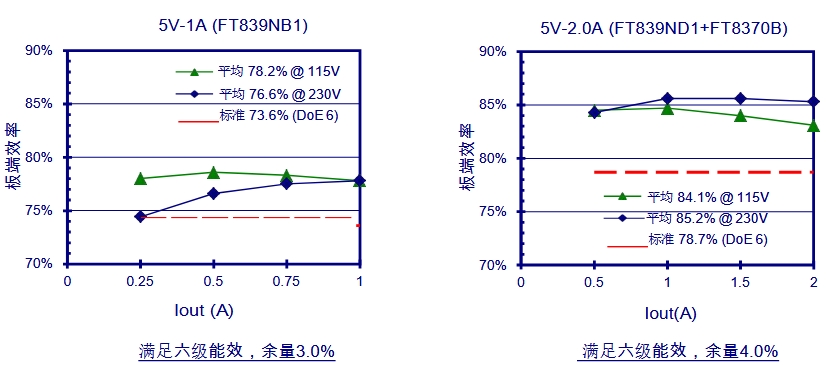 FT839xx/FT8393xx系列芯片在設計上充分考慮了能效優(yōu)化,能夠輕松滿足DoE和CoC六級能效標準。以FT839NB1為例,在115V和230V輸入電壓下,其平均效率分別達到了78.2%和76.6%,遠高于標準要求的73.6%,且余量達到了3.0%。這意味著在實際使用中,該芯片不僅能夠高效地將電能轉換為設備所需的能量,還能在不同負載條件下保持穩(wěn)定的能效表現(xiàn)。