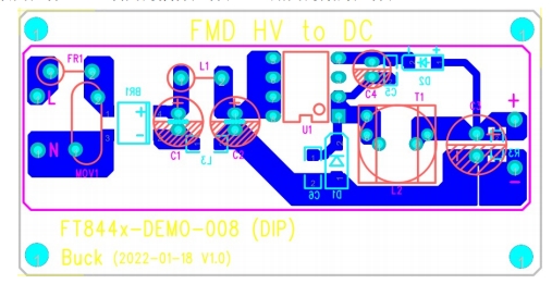 以下是基于 FT8443BD2 的 18V500mA 恒壓輸出電源的 PCB 布局示意圖。元件分布合理,走線清晰,便于生產和調試。