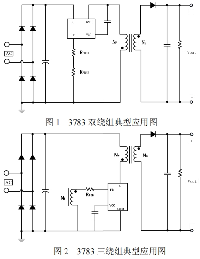 三繞組應(yīng)用是3783系列芯片的另一種典型應(yīng)用方式,其典型應(yīng)用電路如圖2所示。在這種應(yīng)用中,3783芯片的FB腳通過變壓器輔助繞組和FB腳的外置電阻反饋輸出電壓,與內(nèi)部基準(zhǔn)比較形成閉環(huán),從而恒定輸出電壓。