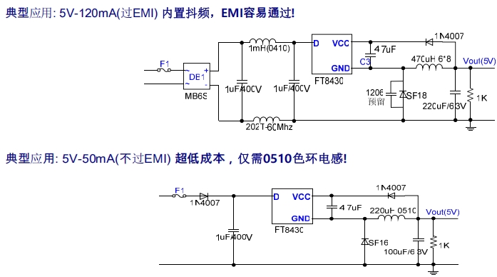 在該電路中,F(xiàn)T8430通過一個470uH的工字電感和一個1uF/400V的電容實現(xiàn)5V-120mA的輸出。該電路具有內(nèi)置抖頻功能,能夠輕松通過EMI測試,適用于需要高精度電壓和低待機(jī)功耗的小家電設(shè)備,如智能插座、智能照明設(shè)備等。